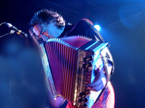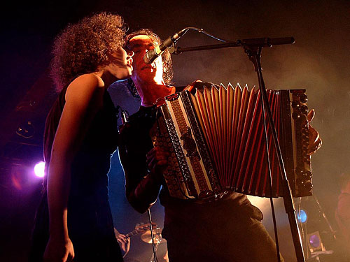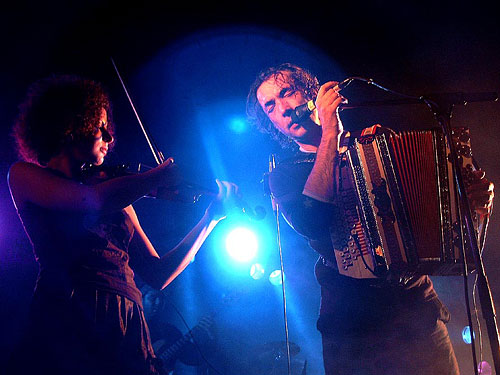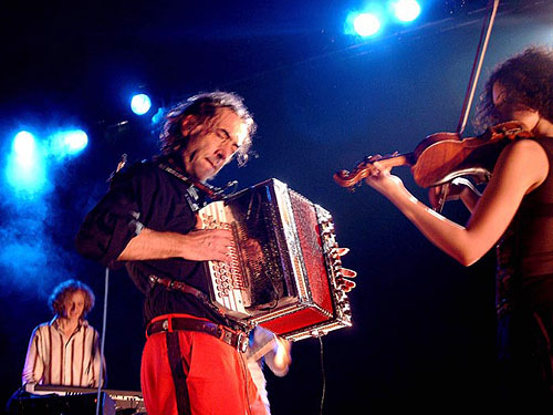 To elicit a strange scratchy blues from the accordion in Fön is really great and bold somehow! I also think the trembling knees in Katholisch, which are convincingly imitated by Marlene's violin, are really cool, Bernd Bechtloff scurries around like a Fraggle on Ecstasy and nearly makes you go wild with his exotic percussion rhythm. Toni Porto's bass gets right into your blood - that is the scraping sounds drift straight into the pit of your stomach, where that drink lands after a good meal and stimulates the surrounding organs to jump for joy. Keyboarder Burkhard Frauenlob takes the key position in every sense of the word and carries the band superiorly through the compositions. The listeners expected a mixture of new and old songs, so that the Alpinkatzen fans were compensated for the missing Koa Hiatamadl. Traditional songs such as Hubert's trad interpretation of Stadltür thus fetched back us again into more domestic realms. If the sound was also not optimally mixed, it harmed neither the atmosphere nor the musical intoxication. Massive encores followed and you had to simply believe Goisern, that he feels somehow connected with the people of Cologne, even if he cannot explain it exactly.