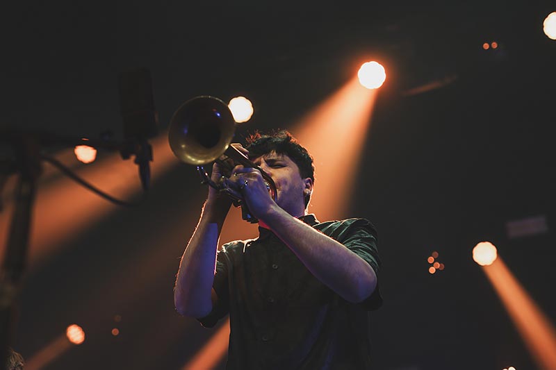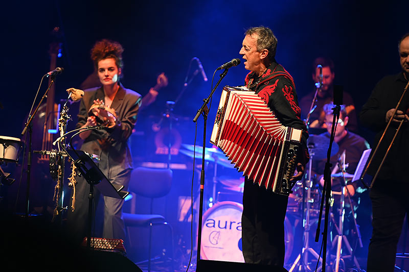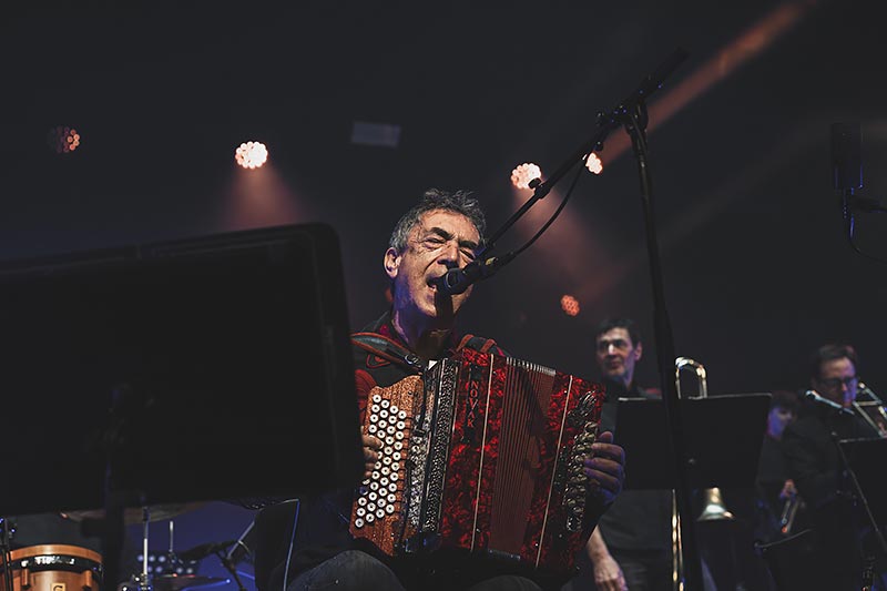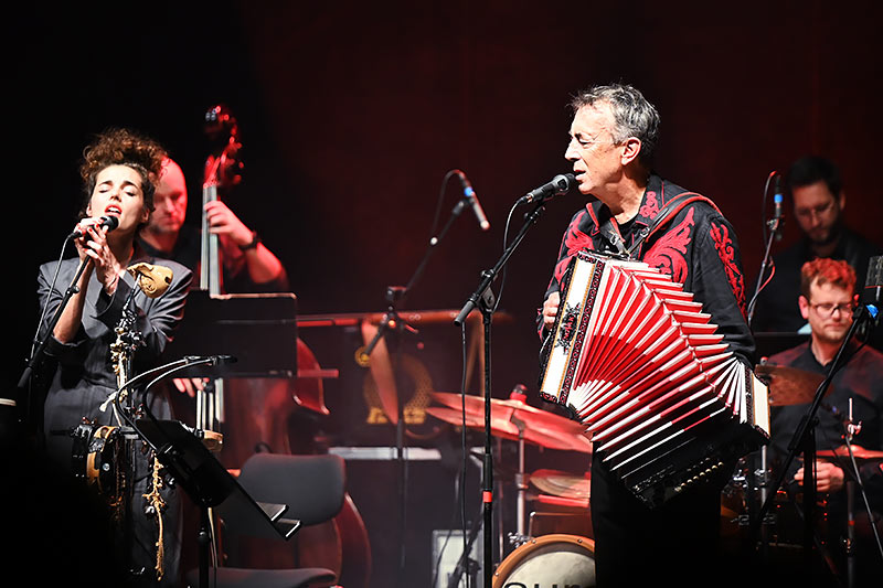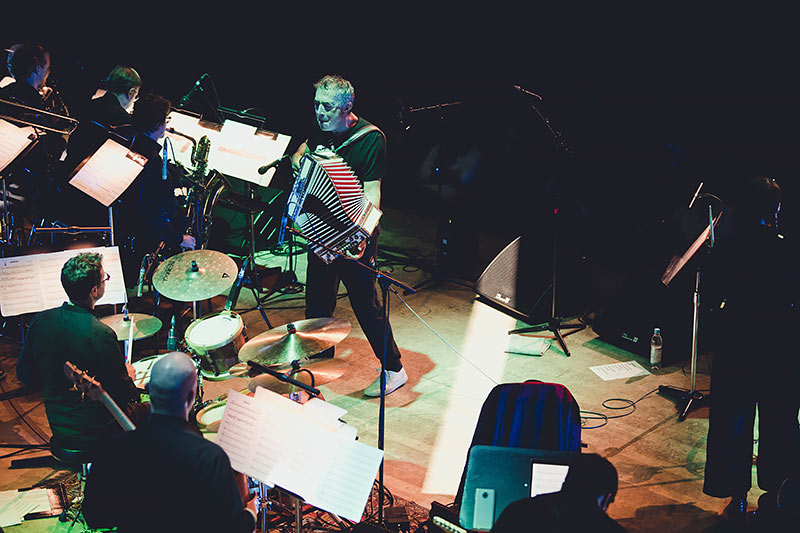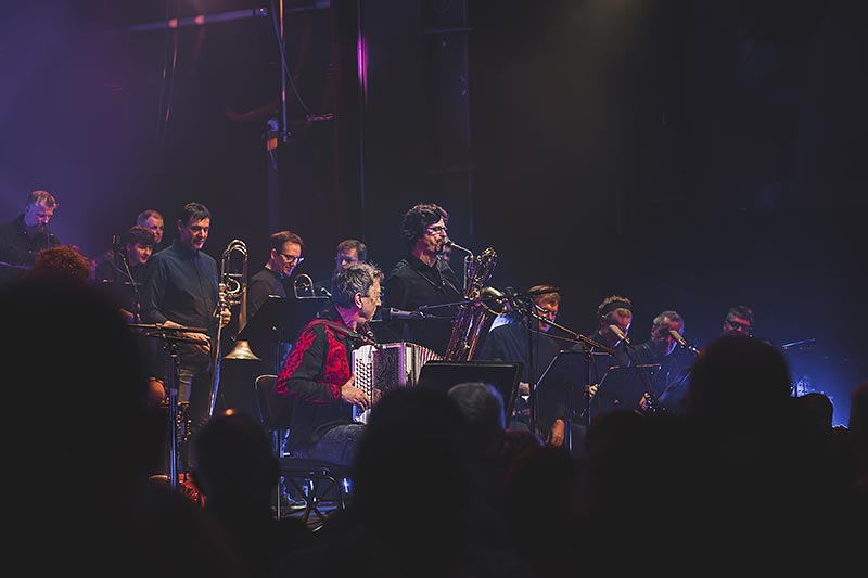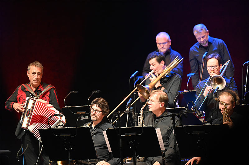 Imagine a noble concert hall in which 13 wind players, a drummer, a stunningly singing percussionist, a bass player, a guitarist, a pianist and a solid front man with an accordion seem completely unpretentious and within a few seconds transform the room into a rich musical film.