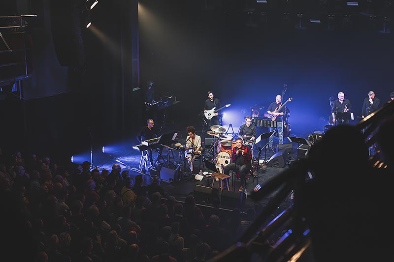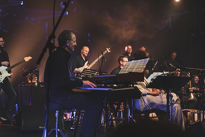 It had no effect on the swing and groove. At full power we promptly head into a varied evening that was designed as a journey through more than 30 years from the Alpinkatzen era to today - with songs from the alpine rock musician in super cinematic sound, mostly arranged for the highly motivated 17 member ensemble by longtime friend and pianist Burkhard Frauenlob.