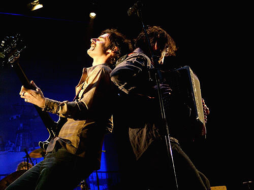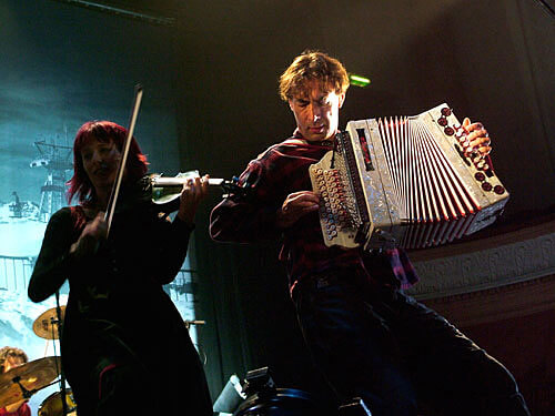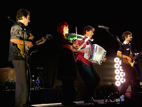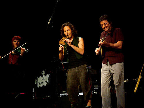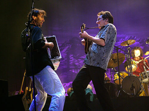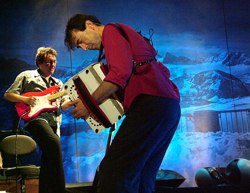 Da stampfen die fünf Vollblutmusiker in krachenden Dreier-Takten über die Bühne, sind dabei unaufhaltsam und gnadenlos. Hubert von Goisern entlockt dem Akkordeon Töne, die man nie erwartet hätte. Es plärrt und hupt, kreischt und lacht, kichert und tobt. Bernd Bechtloff trommelt dazu fordernd den Takt, treibt seine Kollegen munter vor sich her, bereitet ihnen einen Flächensound aus Kuhglocken und anderen alpinen Alltagsgeräusch. Anfangs noch geradezu schüchtern an der Zither supfend, entpuppt sich Max Lässer als aufmüpfiger Derwisch an den sonstigen Saiten-Instrumenten. Von Laute bis E-Gitarre zerlegt er alles, was mindestens vier Saiten hat. Die Duelle, die er sich mit seinem Frontmann liefert, dürften endlos dauern, die balladesken Einwürfe aber auch.