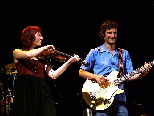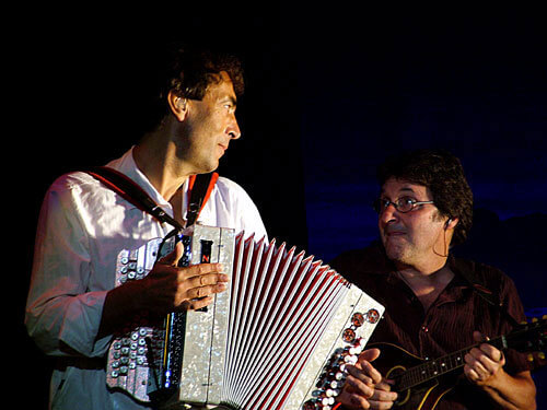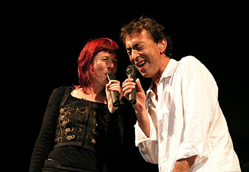 Abgesehen von solchen kleinen Unterbrechungen war das Konzert grandios. Von Goisern, Multiinstrumentalist an Akkordeon, Mundharmonika, Trompete und Querflöte, holte für Album und Konzert ausgesuchte Musiker: Monika Drasch, früher beim Bairisch Diatonischen Jodelwahnsinn, beherrscht ebenfalls viele Instrumente, darunter ein hübscher altrosa Dudelsack. Den kann sie gleichzeitig spielen und zwischen dem Hineinblasen Jodeln. Welches sie ebenso gut beherrscht wie Hubert von Goisern, und so geben beide ein Jodelständchen, a capella. Fein.