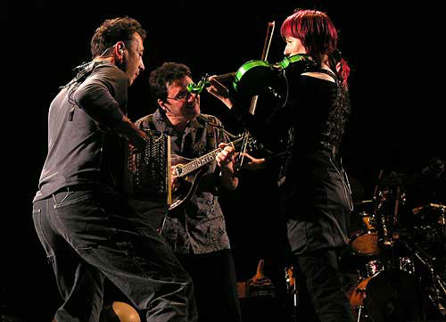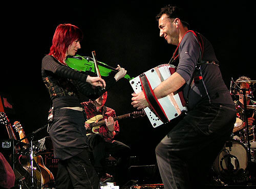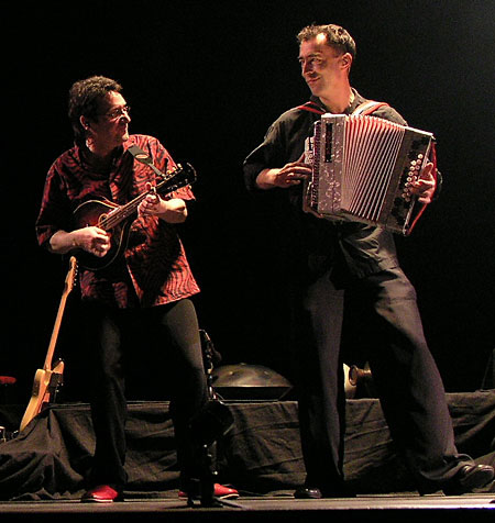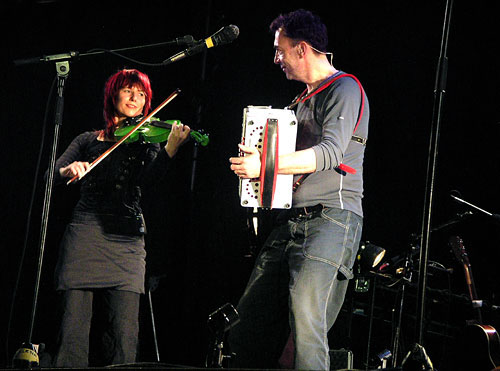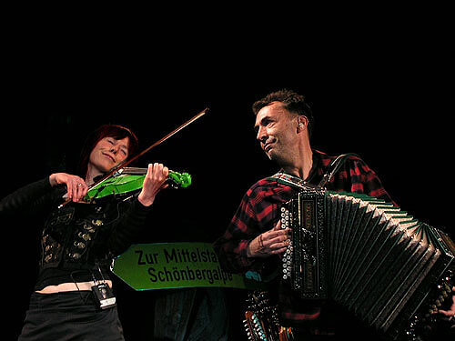 Mit der Hilfe seiner ausgezeichneten Band - Max Lässer (Gitarren), Arnulf Lindner (Bässe), Bernd Bechtloff (Schlagwerk/Geräusche) - setzt er seine Vorstellung dieser Tradition konsequent auch auf der Bühne um - ja, die Lieder wirken sogar noch intensiver, gehaltvoller, sind stimmiger. Nicht zu vergessen natürlich Monika Drasch (Ex-Bairisch Diatonischer Jodelwahnsinn), die mit ihrer grünen Geige, dem lila Dudelsack und mit ihrer facettenreichen Stimme ein eindrucksvolles Gleichgewicht zu Hubert von Goisern darstellt.