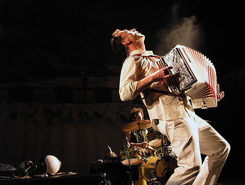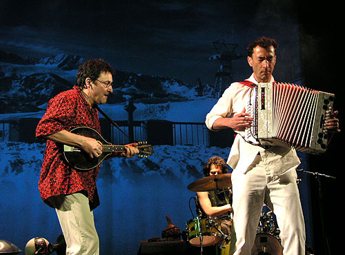 Das Besondere und auch das besonders Schöne an von Goiserns aktuellem Programm dürfte freilich gerade die Abkehr vom Rock bewirkt haben. Zwar schleicht Hubert Achleitner, der Hubert aus Goisern, immer noch gekrümmten Knies in Chuck Berrys Entengang über die Bühne, wenn er seiner Quetschkommode Akkorde abgewinnt, die wie Rock-Riffs eher den Rhythmus als das Melodiespiel stärken. Und auch Drummer Bechtloff begradigt bisweilen den Walzer- oder Polkatakt mit stramm gehackten Vierteln, die jeden Hard-Rock-Song dynamisieren könnten, während Bassist und Gitarrist mehr visuell denn musikalisch an Rock erinnern.