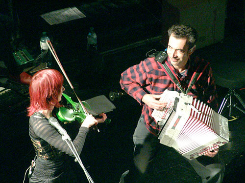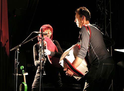 Monika im roten Haar fiedelt auf der grünen Geige, bläst Klarinette, Pfeife und Dudelsack und gibt so manch lakonisches Widerwort. Der Gitarrist greift in ein beeindruckendes Arsenal von Zupfinstrumenten, und am Zaubertisch des Schlagwerkers harrt so ziemlich alles, was klappert, knallt und scheppert, seines Einsatzes. Inklusive der obligaten Kuhglocken.